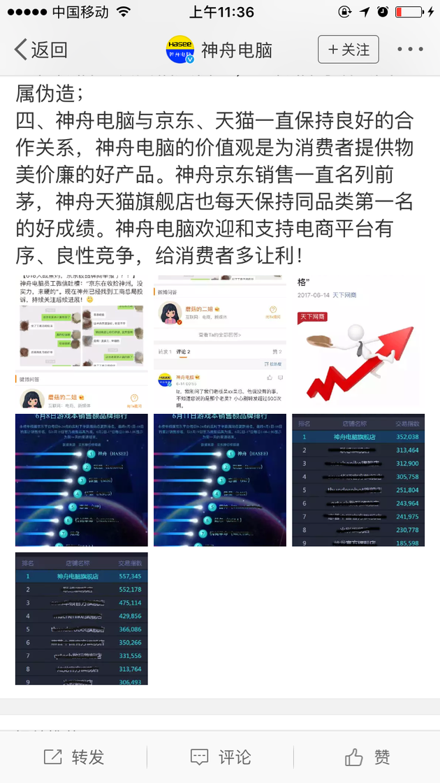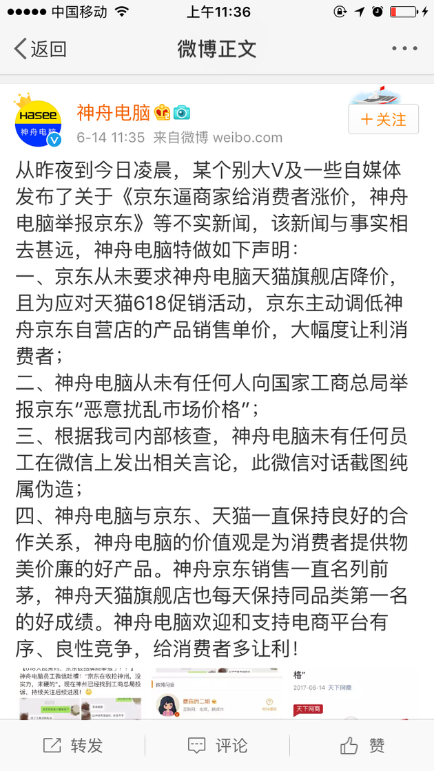 文章发布后,神舟电脑今日午间在微博发布声明否认该事。神舟方面表示,京东从未要求神舟电脑天猫旗舰店涨价。该品牌电脑在618期间的降价,系京东方面主动调低的让利行为。此外,神舟方面经内部核查后发现,没有任何员工在微信上发出过相关言论,也从未有人向国家工商总局进行举报。微信对话截图系伪造。