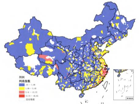 根据网商指数分析,高-高聚集区域呈现出连片发展态势的产业集聚区,范围涉及浙江、江苏、安徽、福建、广东、山东、河北、西藏等多个省级单元。