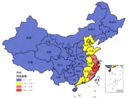 2. 网商水平:以浙江省为中心,由沿海向内陆梯度扩散