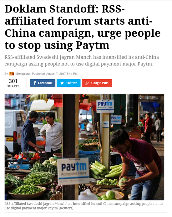 在中印军队洞朗对峙之际,印度民族主义极端组织RSS附属的右翼组织Swadeshi Jagran Manch(以下简称SJM)正在发起愈演愈烈的反华运动,呼吁人们不要使用有中国企业阿里巴巴(158.84, 5.51, 3.59%)投资背景的本国电子支付服务Paytm,同时呼吁印度政府出于经济和安全原因禁止中国对此类公司进行投资。据印度《金融快报》7日报道,SJM联合召集人马哈詹声称,“我们已经电话通知了人们要求他们停止使用Paytm,我们还要求政府禁止中国对诸如Paytm这类公司进行投资,因为这很容易造成安全危机和经济问题,这不利于我们国家的利益”。