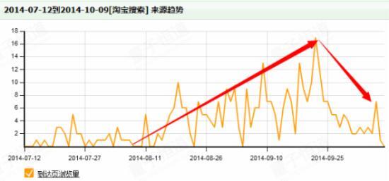 该款宝贝的历史评价和累计销售情况都是比较好的,而且现在已经有了一定的基础销量,自然流量的上升趋势较好,但是在9月25日后流量突然下滑得比较严重。
