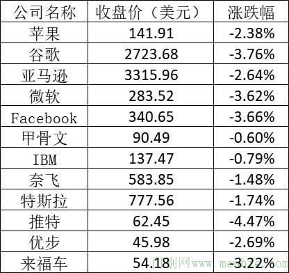 大型科技股普遍下跌,苹果、亚马逊跌幅超过2%,谷歌、微软和Facebook跌幅超过3%。