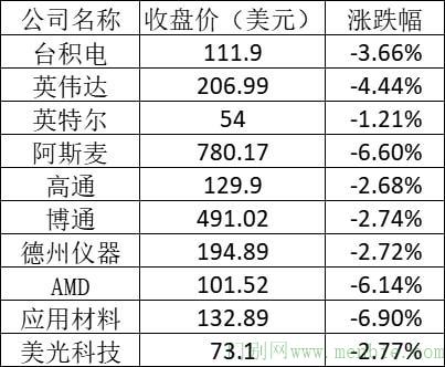美股中的主要芯片股表现如下: