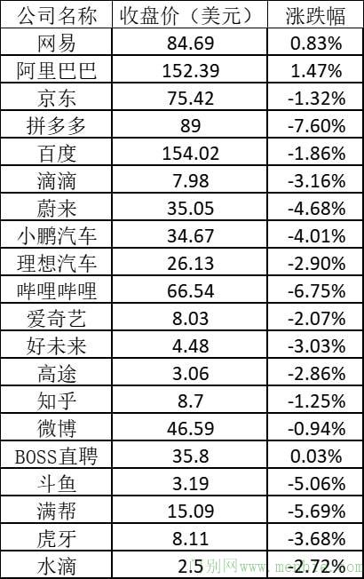 其它热门中概股普遍下跌,其中哔哩哔哩下跌6.75%,满帮下跌5.69%,斗鱼下跌5.06%,滴滴下跌3.16%,百度下跌1.86%,知乎下跌1.25%,BOSS直聘上涨0.03%。