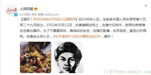 【缅怀!#1952年的今天邱少云牺牲#】他1949年入伍,生前系中国人民志愿军第十五军二十九师战士。1952年10月12日,抗美援朝战场上,在潜伏任务中,敌军的燃烧弹在他身边爆炸。为了不暴露目标,确保战友安全,他强忍剧痛,放弃自救,直至壮烈牺牲。他是战士邱少云,今天是邱少云烈士牺牲纪念日,缅怀!