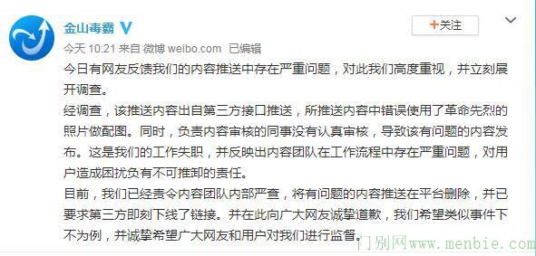 (原标题:金山毒霸承认推送内容错误使用烈士照片:向广大网友诚挚道歉,“希望类似事件下不为例”)