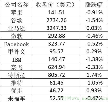 大型科技股普遍下跌,苹果、谷歌、微软、Facebook和奈飞股价均下跌,其中谷歌跌幅超过1%;亚马逊股价逆势上涨,但涨幅不超过1%。