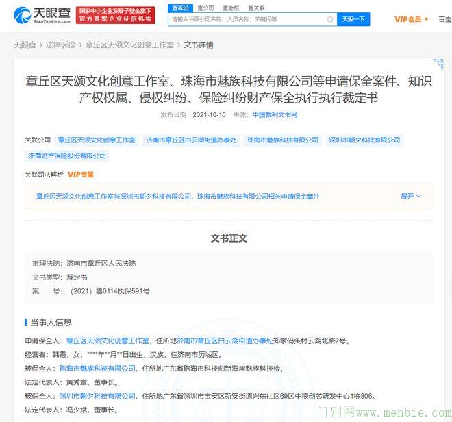天眼查App显示,近日,章丘区天颂文化创意工作室、珠海市魅族科技有限公司等申请保全案件、知识产权权属、侵权纠纷、保险纠纷财产保全执行裁定书公开,审理法院为济南市章丘区人民法院。
