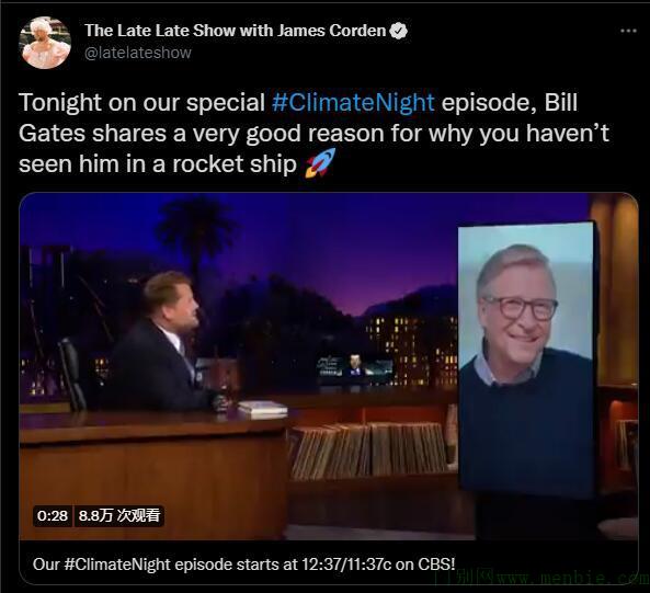 9月24日消息,美国当地时间周三晚间,微软联合创始人比尔·盖茨(Bill Gates)现身《深夜秀》(The Late Late Show)节目。在被问及为何不像其他亿万富翁那样前往太空时,盖茨称“地球上还有很多事情要做”。