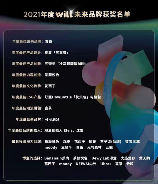 结合对未来品牌定义,首届WILL未来品牌大赏同时召集包括知名投资机构、行业媒体、专家学者等在内的近70位外部评审委员,围绕11个“未来品牌”相关奖项进行提名、打分和投票等3轮选拔。耗时近3个月,320个品牌参与评选,最终,喜茶、观夏、茶颜悦色、可可满分和好瓶HowBottle等19个品牌突出重围,斩获包括产品设计、内容创造、ESG等在内的11项大奖。