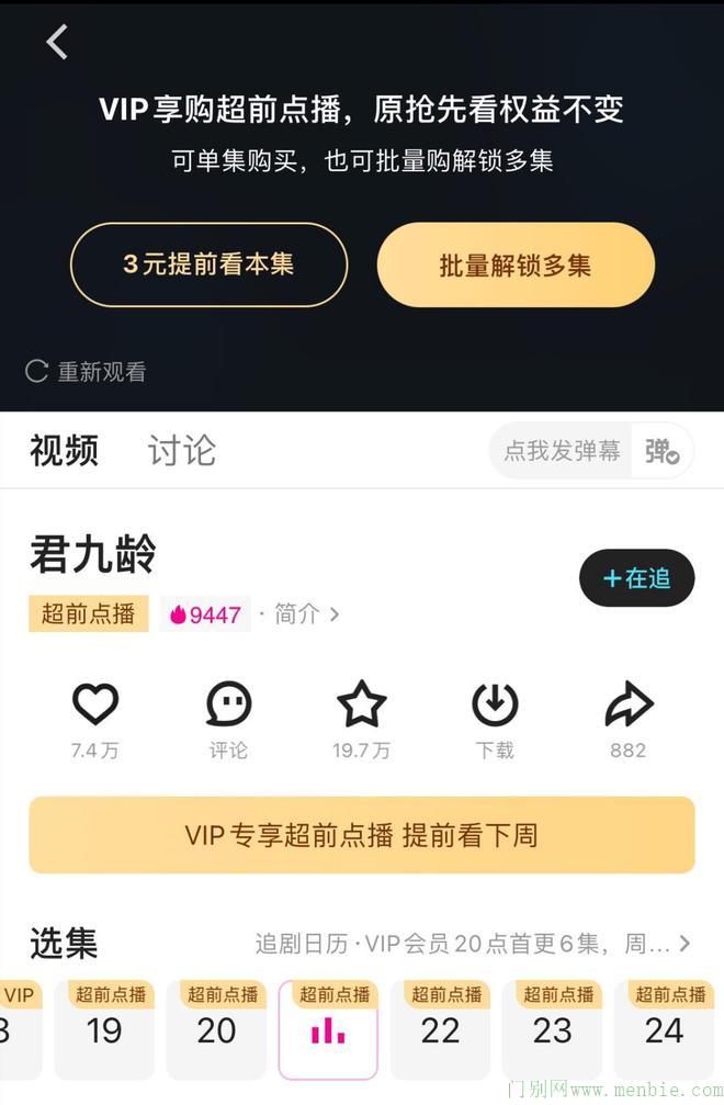 15日,有网友发现,优酷热播剧《君九龄》已经可以选集解锁,同时保留了批量解锁多集的功能。目前该剧超前点播进度更新至24集,观众可以自由选择解锁19-24集中的任意一集,也可以选择批量解锁多集。