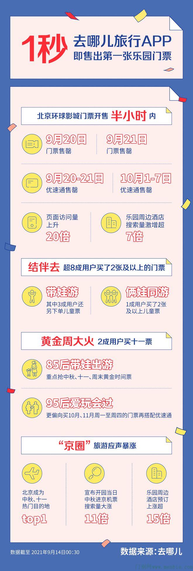 记者询问去哪儿平台获悉,开售半小时内已购门票的用户中,80后、90后用户会购买入园时间更早的标准票和儿童票。考虑到工作和孩子的休息时间,中秋、国庆假期和10月的周末更适合遛娃。