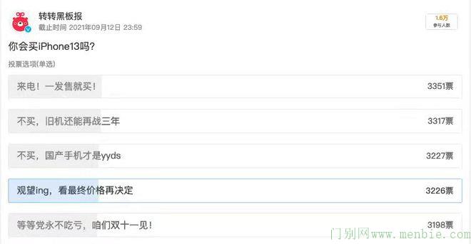 截至9月12日24时,供给有超过1.6万网友参与投票,投票结果显示:仅有20.5%的受访者明确表示会在iPhone13发售后购买。