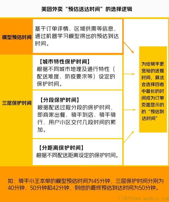 根据美团公布的算法,骑手配送时间并不是简单地由“最近距离除以最快速度”得出,而是引入了一个动态变化的时间,其考虑到了骑手实际配送环节中存在较多不确定性因素;美团表示,对配送时间有四种评估算法,包括“历史数据模型估算时间”、“城市通行状态特性下估算时间”、“出餐到店取餐等配送各场景累加估算时间”和“配送距离估算时间”,而实际订单会以其中最长的一个时间作为预估送达时间,所以即便是相同路线的订单,每天给骑手和用户参考的配送时段也是不一样的。