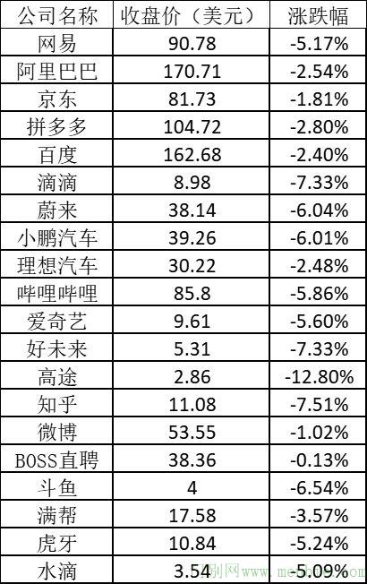 其它热门中概股普遍下跌,其中知乎下跌7.51%,滴滴下跌7.33%,斗鱼下跌6.54%,哔哩哔哩下跌5.86%,满帮下跌3.57%,百度下跌2.40%,BOSS直聘下跌0.13%。