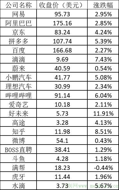 其它热门中概股普遍上涨,其中知乎上涨8.51%,滴滴上涨7.43%,哔哩哔哩上涨6.04%,百度上涨2.27%,BOSS直聘上涨1.29%,斗鱼上涨1.18%,满帮下跌0.44%。