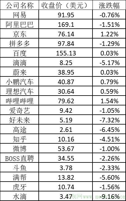 中概电商股多数下跌,阿里巴巴下跌1.51%,京东上涨1.22%,拼多多下跌1.29%。
