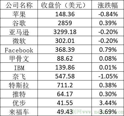大型科技股涨跌不一,谷歌和Facebook股价上涨,但涨幅均不超过1%;苹果、亚马逊、微软和奈飞股价下跌,其中奈飞跌幅超过1%。
