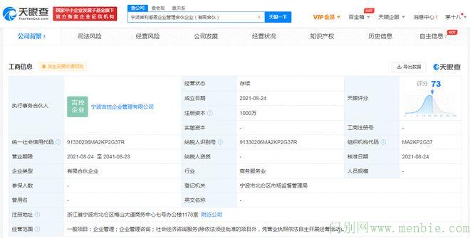 天眼查App显示,8月24日,宁波吉利感恩企业管理合伙企业(有限合伙)成立,执行事务合伙人为宁波吉控企业管理有限公司,经营范围为企业管理;企业管理咨询;社会经济咨询服务。股东信息显示,该企业由李书福、宁波吉控企业管理有限公司共同持股,其中李书福为大股东,持股比例99.9%。