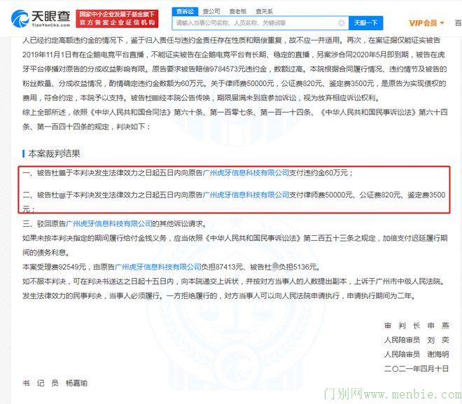 本案裁判结果为被告杜某于本判决发生法律效力之日起五日内向原告广州虎牙信息科技有限公司支付违约金60万元及律师费5万元等。