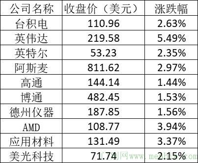 芯片龙头股普遍上涨,且涨幅均超过1%,其中AMD和应用材料涨幅超过3%;英伟达涨幅超过5%,创历史新高。