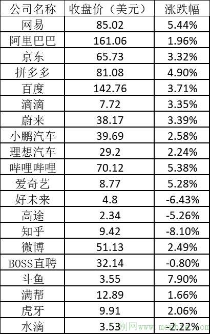 其它热门中概股普遍上涨,其中斗鱼上涨7.90%,哔哩哔哩上涨5.38%,百度上涨3.71%,滴滴上涨3.35%,满帮上涨1.66%,知乎下跌8.10%,BOSS直聘下跌0.80%。
