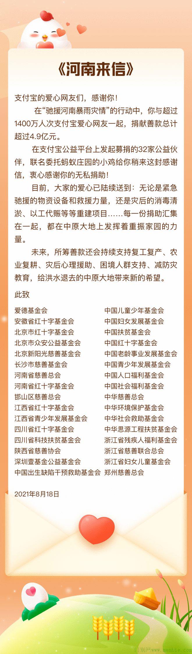 中国扶贫基金会、河南省慈善总会、中国人口福利基金会等在支付宝公益平台上发起募捐的32家公益机构,联名委托蚂蚁庄园的小鸡给向全国网友发出感谢信,感谢大家对河南水灾救助项目的捐赠和帮助,并汇报捐款执行进展。