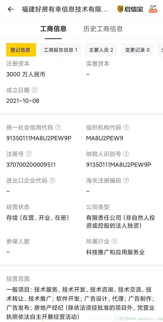 值得一提的是,《每日经济新闻》记者查询启信宝发现,10月8日,福建好房有幸信息技术有限公司(以下简称福建好房有幸)成立,注册资本3000万元,经营范围就包含房地产经纪。股权穿透显示,该公司由北京好房有幸100%控股。