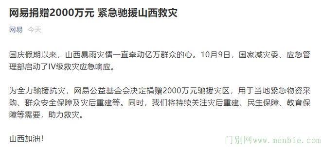 10月10日消息,网易公益基金会宣布,捐赠2000万元驰援山西灾区,用于当地紧急物资采购、群众安全保障及灾后重建等。
