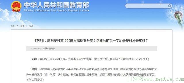 近日,教育部在官网回答网友“专升本毕业后的第一学历是专科还是本科”的问题时,明确国家教育行政部门相关政策及文件中没有“第一学历”这个概念。教育部在答复中还说,在管理过程中所说“学历”通常指的是个人获得的最高或最后的学历。