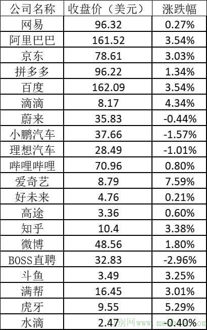 其它热门中概股普遍上涨,其中滴滴上涨4.34%,百度上涨3.54%,知乎上涨3.38%,斗鱼上涨3.25%,满帮上涨3.01%,哔哩哔哩上涨0.80%,BOSS直聘下跌2.96%。