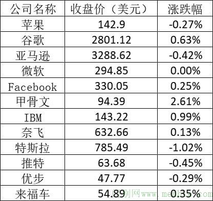 大型科技股涨跌不一,谷歌、Facebook和奈飞股价均上涨,但涨幅均不超过1%;苹果和亚马逊股价下跌,但跌幅均不超过1%。