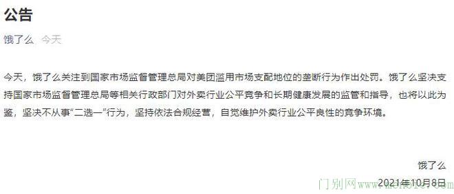 饿了么今日发布公告称,今天,饿了么关注到国家市场监督管理总局对美团滥用市场支配地位的垄断行为作出处罚。饿了么坚决支持国家市场监督管理总局等相关行政部门对外卖行业公平竞争和长期健康发展的监管和指导,也将以此为鉴,坚决不从事“二选一”行为,坚持依法合规经营,自觉维护外卖行业公平良性的竞争环境。