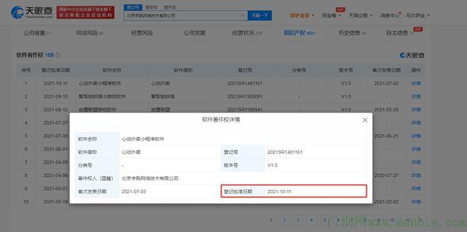 天眼查App显示,北京字跳网络技术有限公司心动外卖小程序软件获得登记批准,登记号为2021SR1481161,批准日期为2021年10月11日。