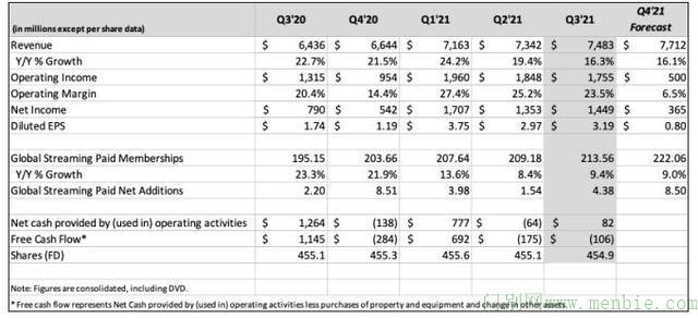 当季全球流媒体付费用户数净新增438万,显著高于公司官方指引的350万以及分析师预期的372万,并较2020年三季度的新增220万翻倍。这令季末其全球流媒体付费用户总数升至2.14亿,高于分析师预期的2.13亿。去年末,这一总数曾首度超过2亿大关。