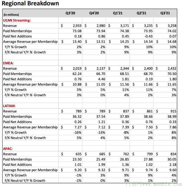 亚太地区连续第二个季度成为会员增长的最大贡献者,付费净增220万,占当季总增量的一半。欧洲、中东和非洲地区的用户增加180万,显著高于二季度的增量18.8万,主要由于一些剧目产生了特别强烈的反响。拥有该公司最大用户群的美国和加拿大新增订阅7万,扭转了二季度时新增用户环比减少的不佳趋势,拉美地区会员增速也较慢,与当地市场接近饱和有关。