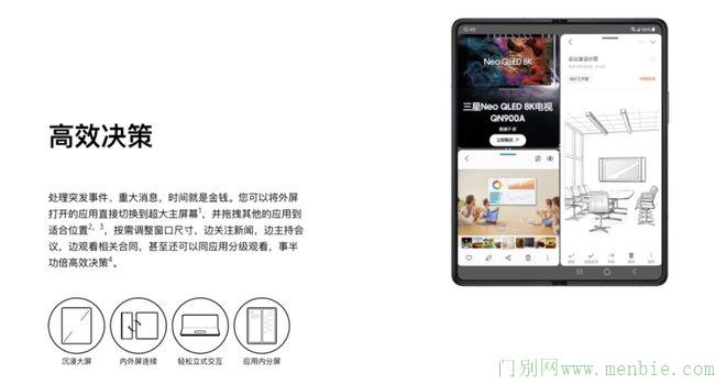 为折叠屏提供的另一个提高工作效率的场景就是分屏协同工作。在三星官方的宣传图中,全部展开的屏幕可以支持三个应用同时呈现,在文案中也都是将“关注新闻”、“主持会议”、“观看合同”等使用场景集合在一起来勾勒出商务精英人士的工作使用场景。