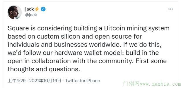 2021年10月16日,美国数字支付服务商 Square 的CEO Jack Dorsey 在推特上发文,宣称 Square 正在考虑构建一款基于定制芯片的开源比特币挖矿系统,用户(矿工)可以和社区一起完善这个挖矿系统。