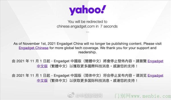 据雅虎中国官网公告,2021年11月1日起,用户无法从中国大陆使用Yahoo的产品与服务,但不影响Yahoo在全球其他地方的产品及服务。此外Yahoo旗下科技媒体Engadget宣布,11月1日起关闭提供简体中文内容的“Engadget中国版”。据了解,雅虎曾经是全球第一门户搜索网站,2015年,雅虎宣布关闭雅虎北京全球研发中心。(记者 张旭)