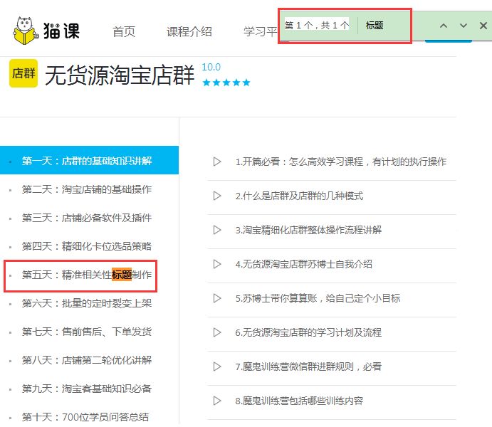 基本是两种方法,一种就是直接在课程目录上查关键字,打开目录,键盘敲击Ctrl+F,输入关键词,譬如搜索标题,就可以快速找到我要看的课程在哪里。