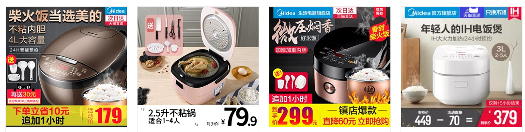 在标品上也是有同样的道理,如下图,当我们搜索“电饭煲”时,其他主图在电饭煲旁边放一碗米饭,只有一张图片显示为打开后锅里炖了鸡汤,这就使这张商品图具备了视觉上的差异性,消费者会认为这个电饭煲的功能还挺齐全,于是有了点击浏览的兴趣。