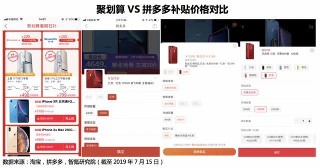 除此之外,阿里聚划算频道也正在进行暑期补贴,汽车、家电、手机均开启疯狂补贴降价模式。以拼多多百亿补贴入口和淘宝聚划算入口中的iPhone XR 128G红色为例,拼多多补贴价格为5149元,而淘宝为5188元,对比苹果官方旗舰店的6699都有1000以上的降幅。