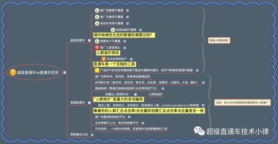 我们先来看一张非完整版本【超级直通车技术操作原创思维导图】,当你看到这幅思维导图的时候,如果我没有猜错的话,此刻大部分但凡对直通车有操作认知的人都会觉得不可思议,或者难以置信;这里的不理解不是说技术有多么的神奇,主要因为你没有看到自己想看到的内容,说通俗一点讲就是你想从这个逻辑里去找到一些与你自己操作方法上的重叠或者说是相似的部分;但是不好意思,我可能让诸位失望了