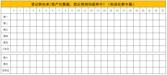 通过红色框框的指引,大家点击进入数据收集界面,然后把最近1周(最长可以统计最近30天)的转户率/投产比数据登记到表格内,然后进行2个时间周期的计算!