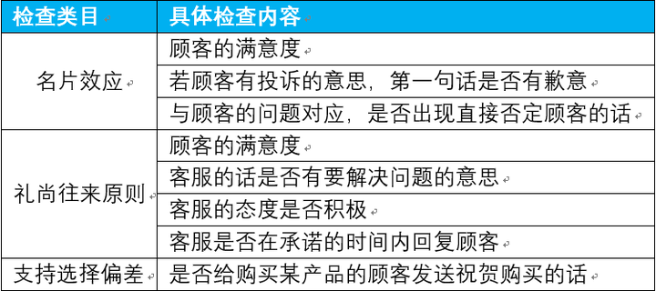 如果按照表中的内容,对售后客服和顾客的聊天内容进行检查,就能将感性的客服话术转化为具体的得分指标。依据不同的服务场景,对客服的话术要求就能拆分并细化成一套标准化的话术规则体系了,而客服的服务得分则取决于她在这个规则体系中的综合表现。例如要检查“当顾客有投诉意愿时,第一句话是否有歉意”时,可以检查当顾客的问题属于类似于“你们家的衣服怎么褪色这么严重”这种含有强烈投诉意愿的句子时,客服的第一句话是否与“亲,实在抱歉哦,给您造成麻烦了”这样含有歉意的句子类似。