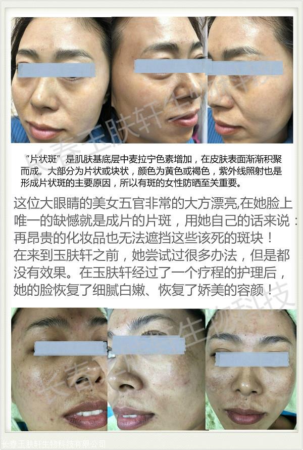 6、贴心方案:依照顾客本人工作性质,时间,斑的类型来制定合适的祛斑方案.我们仪器取斑只需要5次,第一次仪器把黑色素分解代谢到皮肤表面,根据斑的情况,如果属于重度斑在面部敷上玉肤轩草本面膜,第二次至第四次深层黑色素全部被析出到皮肤表面,第五次后脸上斑点全部去除淡化至基本看不到,皮肤白皙,细腻有光泽。