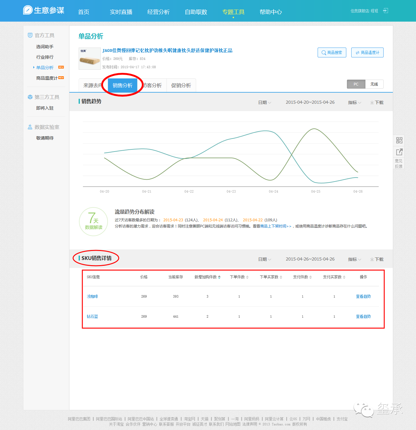 生意参谋单品SKU销售分析,统计了多个维度的数据供商家进行趋势分析及决策判断。