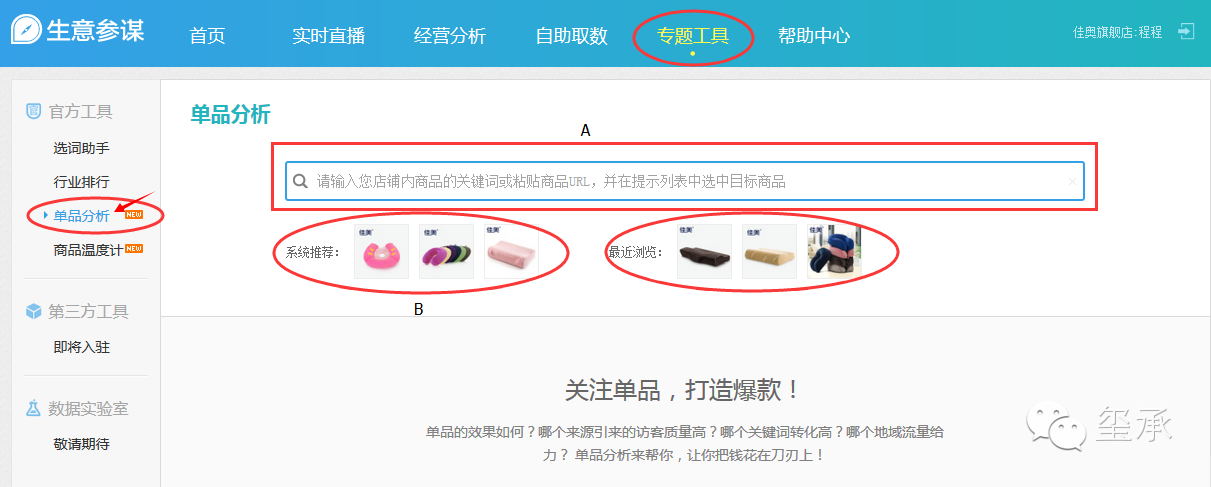 首先进入专题工具下的单品分析模块,生意参谋提供了三种查询方式:单品链接查询丶系统推荐查询丶最近浏览查询。