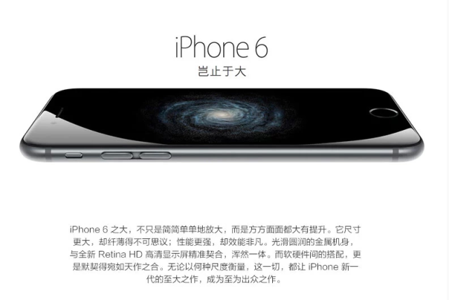 iPhone6的比较主要是跟iPhone5的比较,是同款的比较,而大是它相比于5的一个亮点卖点,对消费者同样具有吸引力。溢价的关键在于比较。