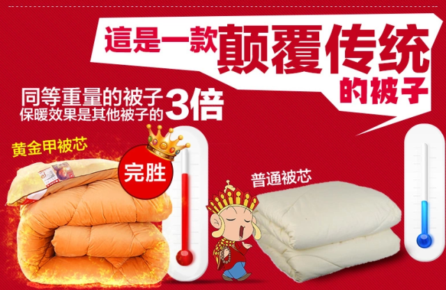 这款黄金甲的被子就充分运用了产品比较,通过保暖效果的优势完胜普通被芯。而温度计的设置也令消费者的感受更加直观。